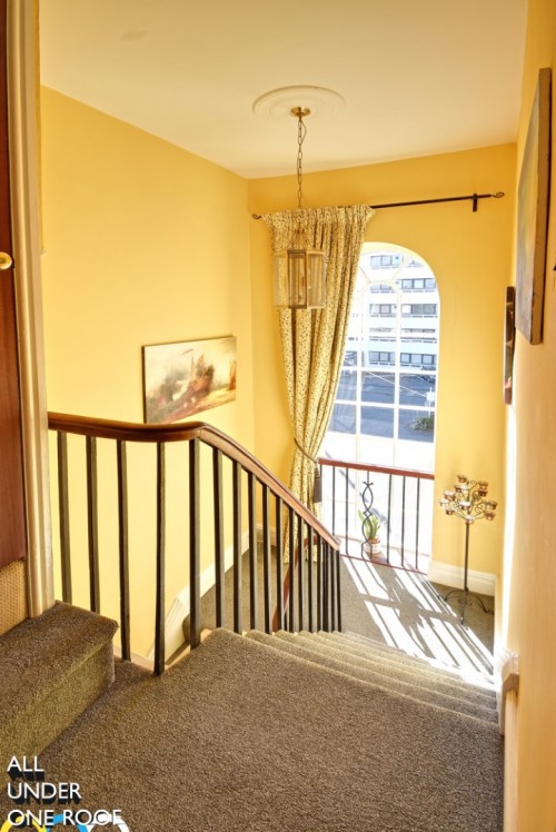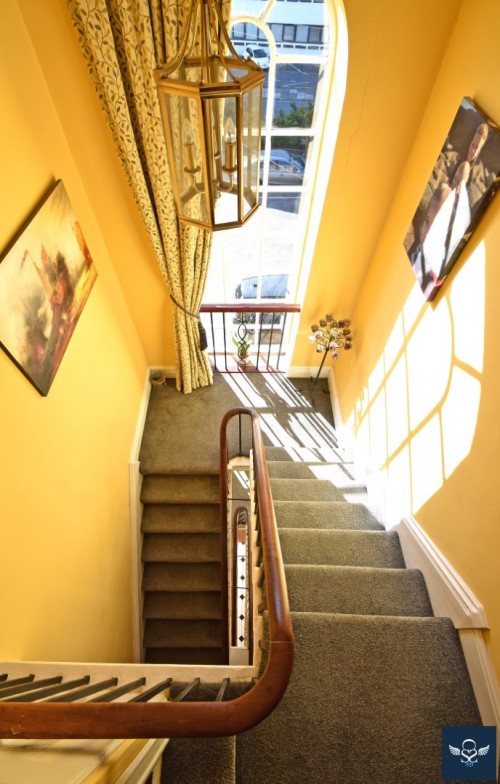 Impressive square pan glazed window to the rear elevation. Stone steps with wrought iron balustrade and polished wood handrail ascending to the first floor level.