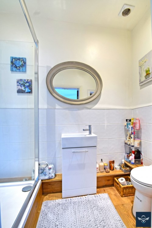 7’0” x 3’0”Two piece white suite incorporating low-level WC and wash hand basin set into vanity-style unit with tiled splashbacks, laminate wood floor, radiator, inset spot lighting to ceiling with extractor, wall mounted Worcester gas combination boiler.