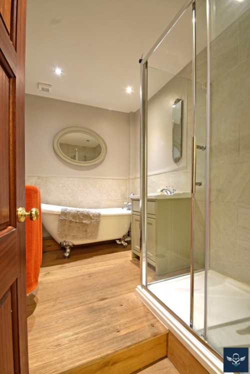 5’10” x 9’06”Three piece suite incorporating rolled top free-standing bath, wash basin set into modern vanity-style unit and step in glazed shower cubicle with chrome mixer shower fittings and tiled area over, half-tiled walls, combination heated towel rail and radiator, laminate wood floor, inset spot lighting to ceiling with extractor.