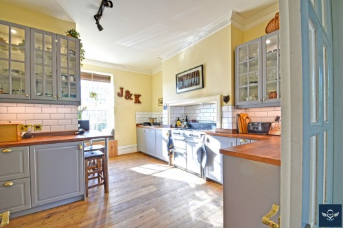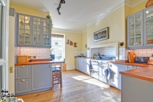 15’05” x 14’01”1 ½ bowl modern composite sink unit and drainer with cupboards under, comprehensive range of base, tall and illuminated glazed display units, co-ordinating timber worktops with concealed illumination extending to provide breakfast bar, part-tiled walls. Recess to chimney breast with space for range-stye cooker with extractor hood over, integrated dishwasher and microwave, space for American-style fridge freezer, Karndean-style floor area, coved ceiling. Glazed sash window to the rear elevation.