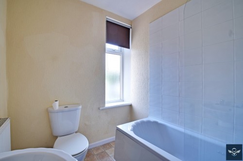 Three piece white suite incorporating panelled bath with mixer shower fittings, tiled area and glazed screen over, pedestal wash basin and low-level WC, radiator. UPVC framed frosted double glazed window to the rear elevation.