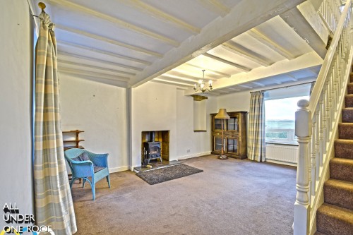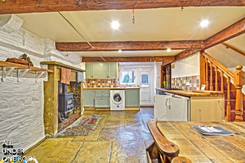 17’10” x 15’01” Stairs with spindle balustrade ascending to the first floor level, cast-iron multi-fuel stove set onto stone hearth with stone inlay, beamed ceiling, feature stone display niche with stone lintel over, two radiators. UPVC framed double glazed window to the front elevation and UPVC framed double glazed window overlooking the rear garden. understairs access with steps descending into:-
