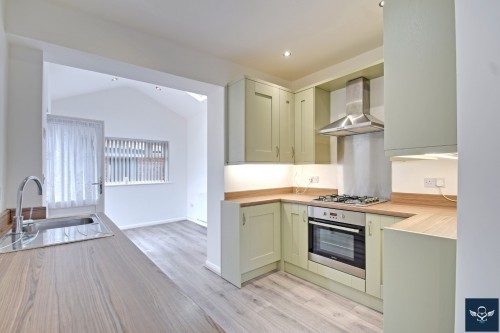 6’09” x 9’06” Stainless steel sink unit and drainer with cupboards under, matching range of wall and base units incorporating oven / grill and four ring gas hob with stainless steel extractor canopy over, co-ordinating worktops with upstands and concealed illumination, integrated fridge and washing machine, inset spot lighting to ceiling. Laminate wood floor extending into:-