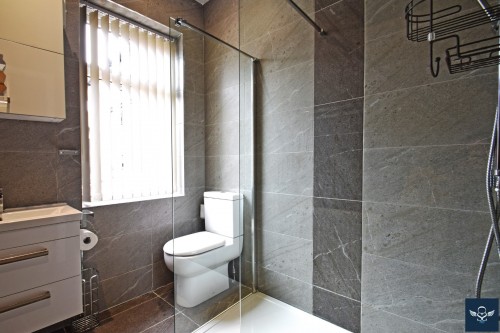 6’07” x 5’09” Three piece modern white suite incorporating wash basin set into cantilever vanity style unit, low-level WC and step in shower with chrome mixer rain shower fittings and tiled area over, tiled walls and ceiling, inset spot lighting to ceiling with extractor, radiator. UPVC framed double glazed window to the rear elevation.