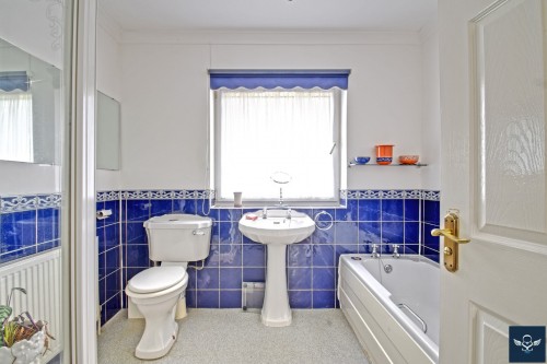 7’03” x 8’08” Four piece white suite incorporating low-level WC, pedestal was basin, panelled bath and step in glazed shower cubicle with mixer shower fittings and tiled area over, half-tiled walls, coved ceiling, radiator. UPVC framed frosted double glazed window, inbuilt storage cupboard with louvre door.
