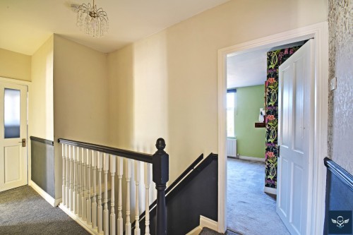 5’05” x 14’02”Return spindle balustrade, loft access point. Gloss panelled doors leading from the hallway and opening into:-