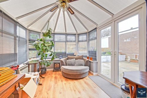 12’0” x 9’10” UPVC framed double glazed construction set onto dwarf walling, laminate wood floor, electric convector heater. UPVC double glazed French-style doors opening into the rear garden.