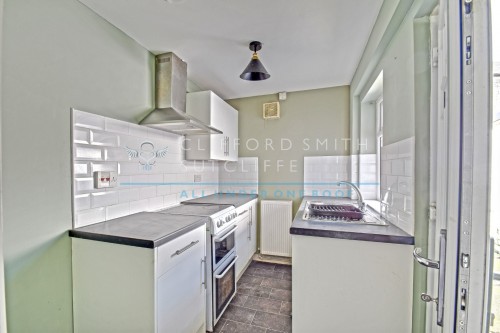 9’0” x 6’04” Stainless steel sink unit and drainer with cupboard under, matching range of wall and base units with space for slot-in electric cooker, stainless steel extractor canopy over, coordinating worktops and part-tiled walls, plumbing for washing machine, radiator. UPVC framed double glazed window and UPVC rear entrance door.