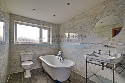 10’08” x 7’02” Three piece white suite incorporating freestanding rolled top clawfoot bath, wash basin and low level WC, fully tiled walls and floor, combination radiator heated towel rail, inset spotlighting to ceiling. UPVC framed frosted double glazed window to the front elevation.
