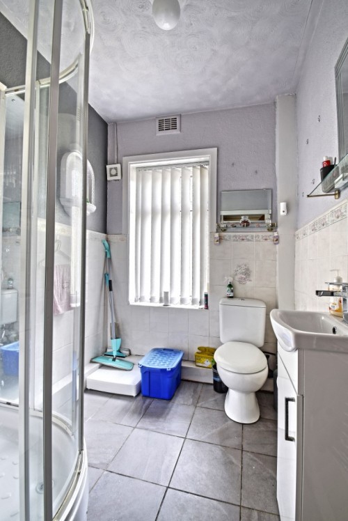 6’10” x 6’02” Three piece white suite incorporating corner glazed shower cubicle, low level WC and wash basin set into vanity-style unit, tiled walls and floor, chrome heated towel rail, extractor. UPVC framed frosted double glazed window.