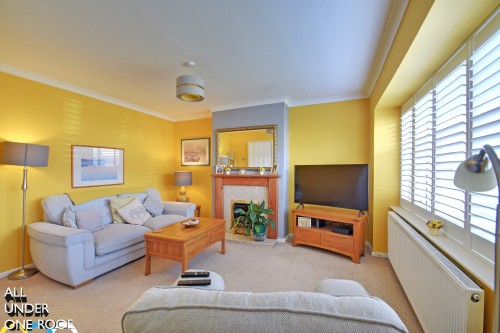 13’0” x 11’09” into chimney breast recess. Feature fireplace with marble inlay / hearth and inset coal-effect living flame gas fire, coved ceiling, radiator. UPVC framed double glazed picture-window to the front elevation. Opening into:-
