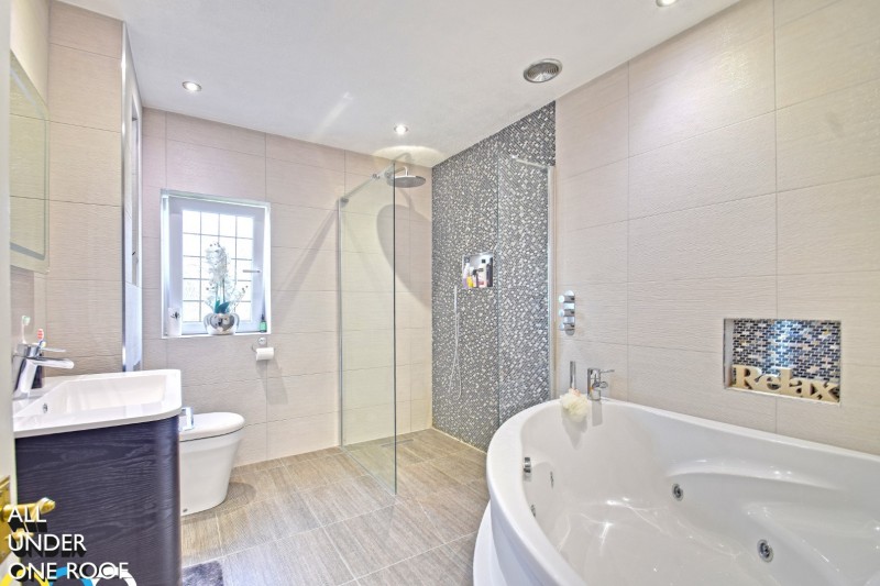 7’10” x 9’09” Four piece modern white suite incorporating corner spa-bath, wash basin set into cantilever vanity-style unit, low-level WC with concealed cistern and shower with chrome mixer rain shower fittings, tiled area and glazed screen over, fully tiled walls with illuminated display / toiletry shelves, tiled floor area, inset spot lighting to ceiling with extractor, anthracite heated towel rail. UPVC framed frosted double glazed window.