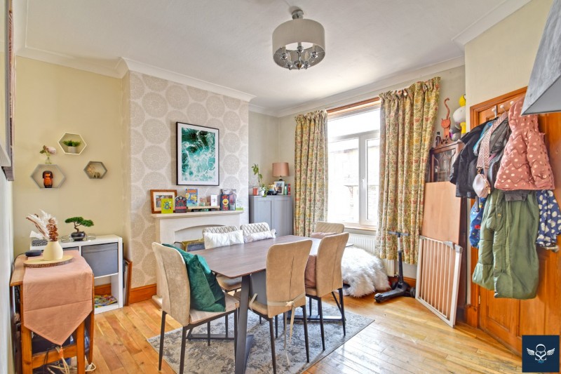 12’05” x 14’0” Coved ceiling, dado rail, two radiators, wall light points. UPVC framed double glazed window to the rear elevation, understairs storage cupboard. Panelled door opening into:-