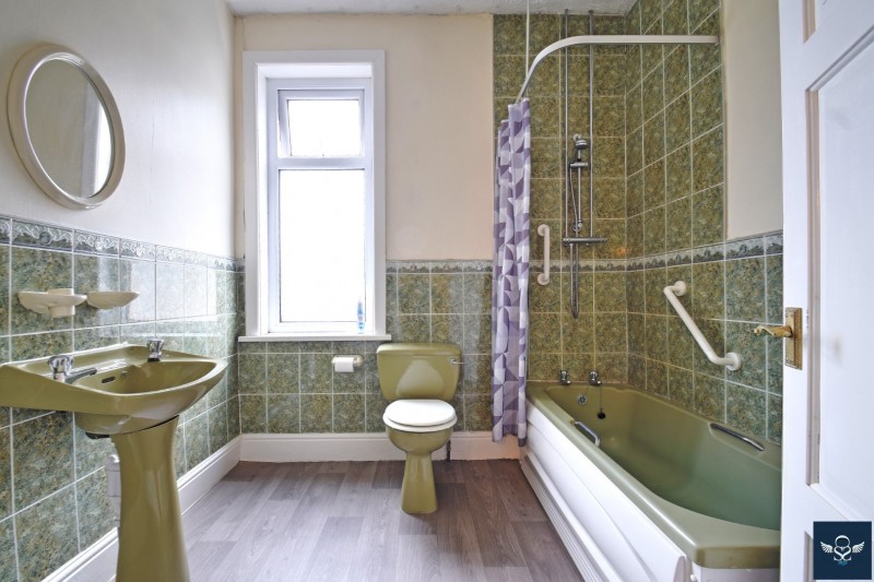 7’10” x 7’08” Three piece suite incorporating panelled bath with chrome mixer shower fittings and tiled area over, pedestal wash basin and low-level WC, radiator, half tiled walls. UPVC framed frosted double glazed window.