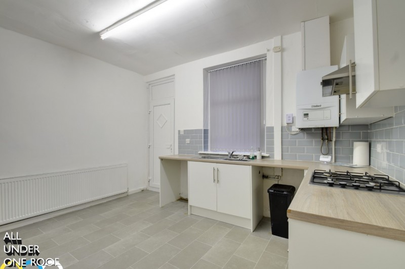 10’0” x 7’0” 1 ½ bowl stainless steel sink unit and drainer with cupboards under set into UPVC framed double glazed square-bay window, matching range of wall and base units, co-ordinating worktops and part-tiled walls, wall mounted Main gas combination boiler, space for tall fridge freezer, space for slot in gas cooker, boarded ceiling with inset spot lighting, tiled floor area, plumbing for washing machine. UPVC door with frosted double glazed centre panel leading into the rear yard.