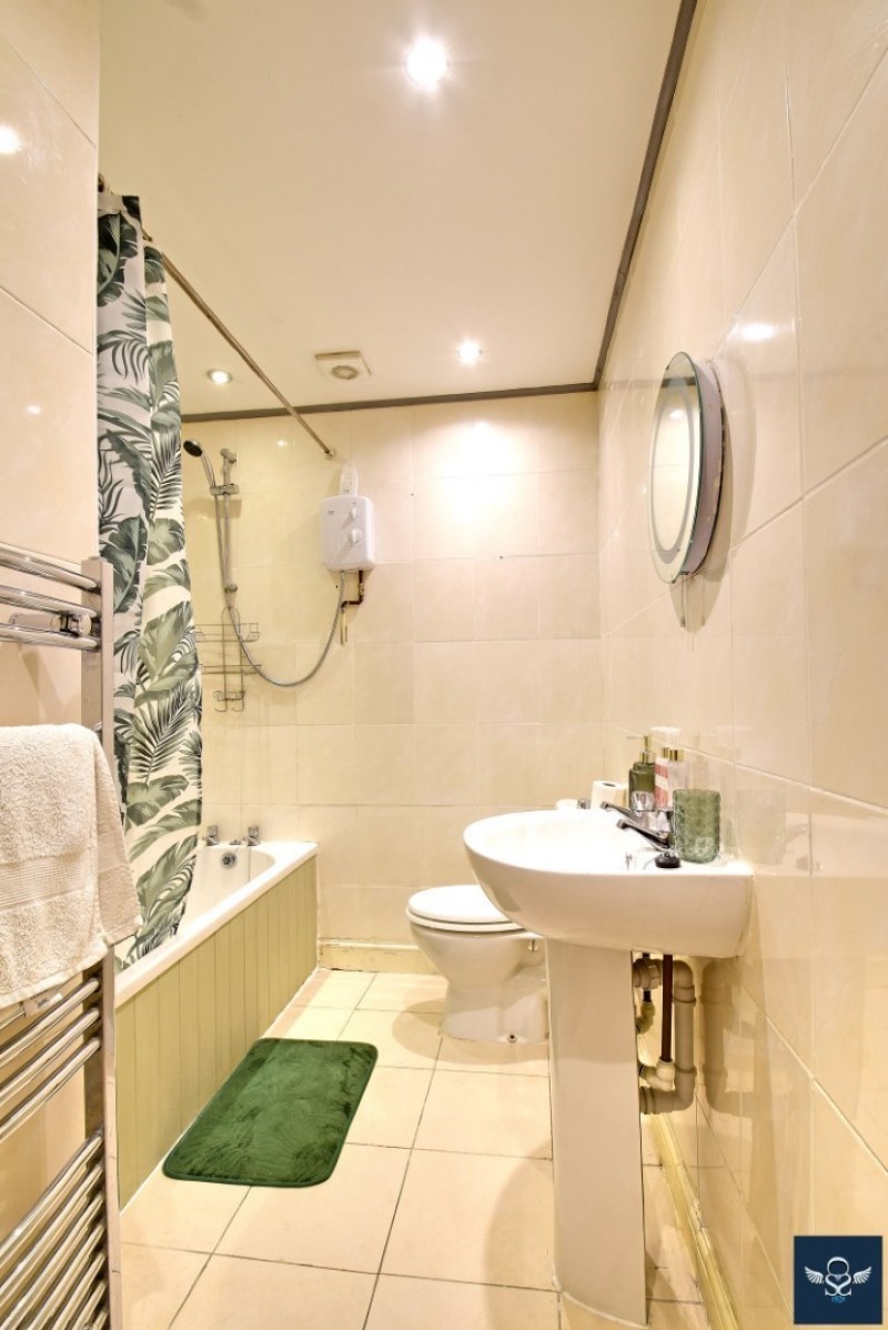 6’01” x 10’01” Three piece white suite with electric shower fittings and tiled area over, pedestal wash basin and low-level WC, tiled walls and floor, chrome heated towel rail, inset spot lighting to ceiling with extractor.