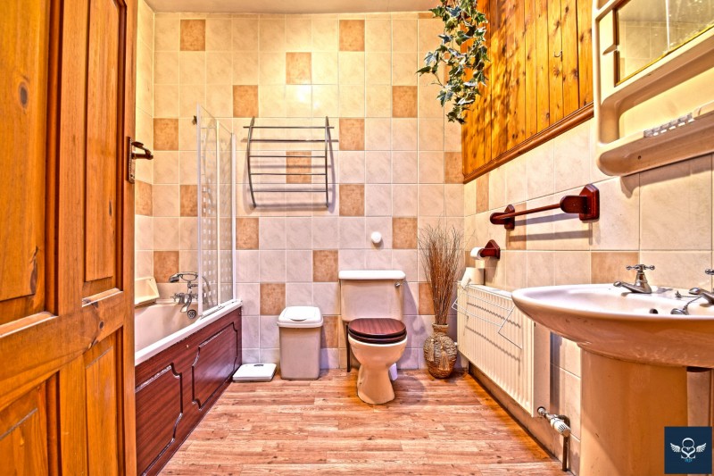 7’11” x 7’04” Three piece suite incorporating panelled bath with tiled area and glazed screen over, pedestal wash basin and low-level WC, tiled walls, tongue and groove boarding, extractor, radiator, frosted glazed skylight.